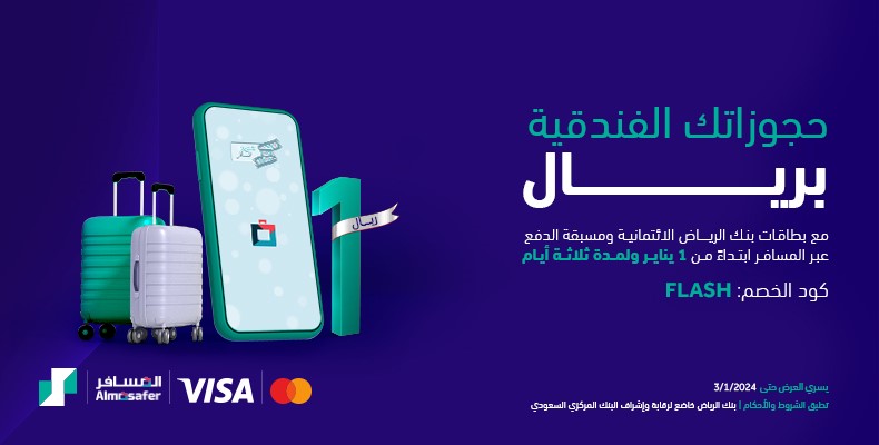 - احجز فندقك بـ 1 ريال فقط عند استخدام كود الخصم FLASH لـ 50 عميل لكل يوم.