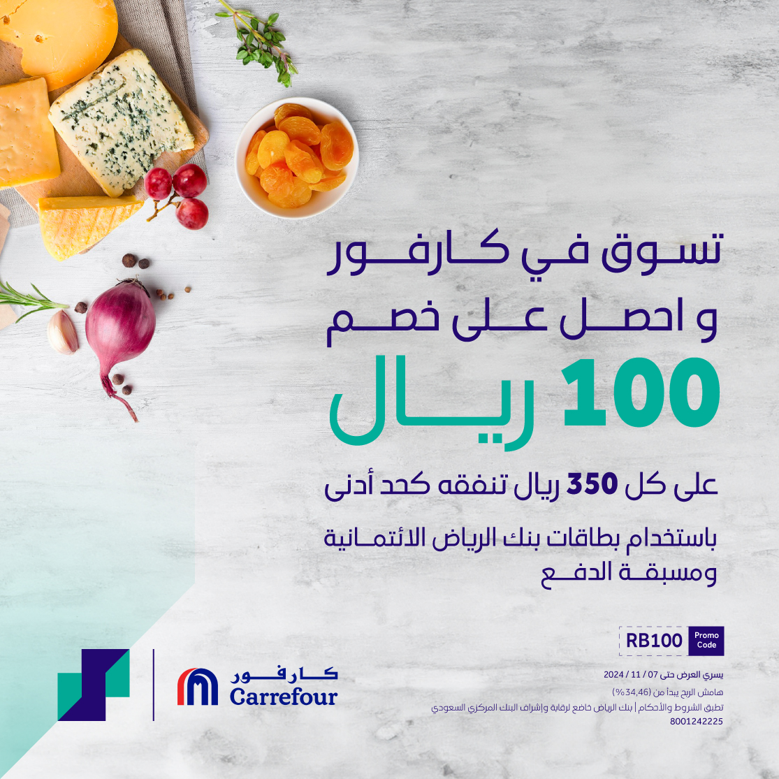 احصل على خصم 100 ريال عند التسوق في كارفور باستخدام بطاقتك الائتمانية أو مسبقة الدفع من بنك الرياض!